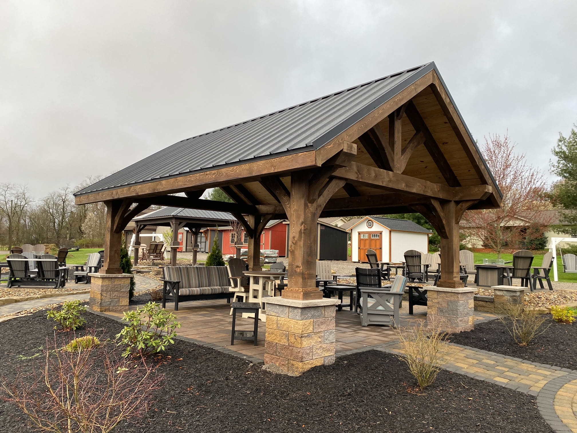 There's no substitute for the visual weight of a timber-framed structure. The heavy posts, the exposed beam connections, the natural grain of real wood — these aren't details you can replicate with a kit. A Yoders timber-framed pavilion is built from structural timber that gives the space a sense of permanence and permanence a sense of place. It doesn't just cover your outdoor space. It anchors it.