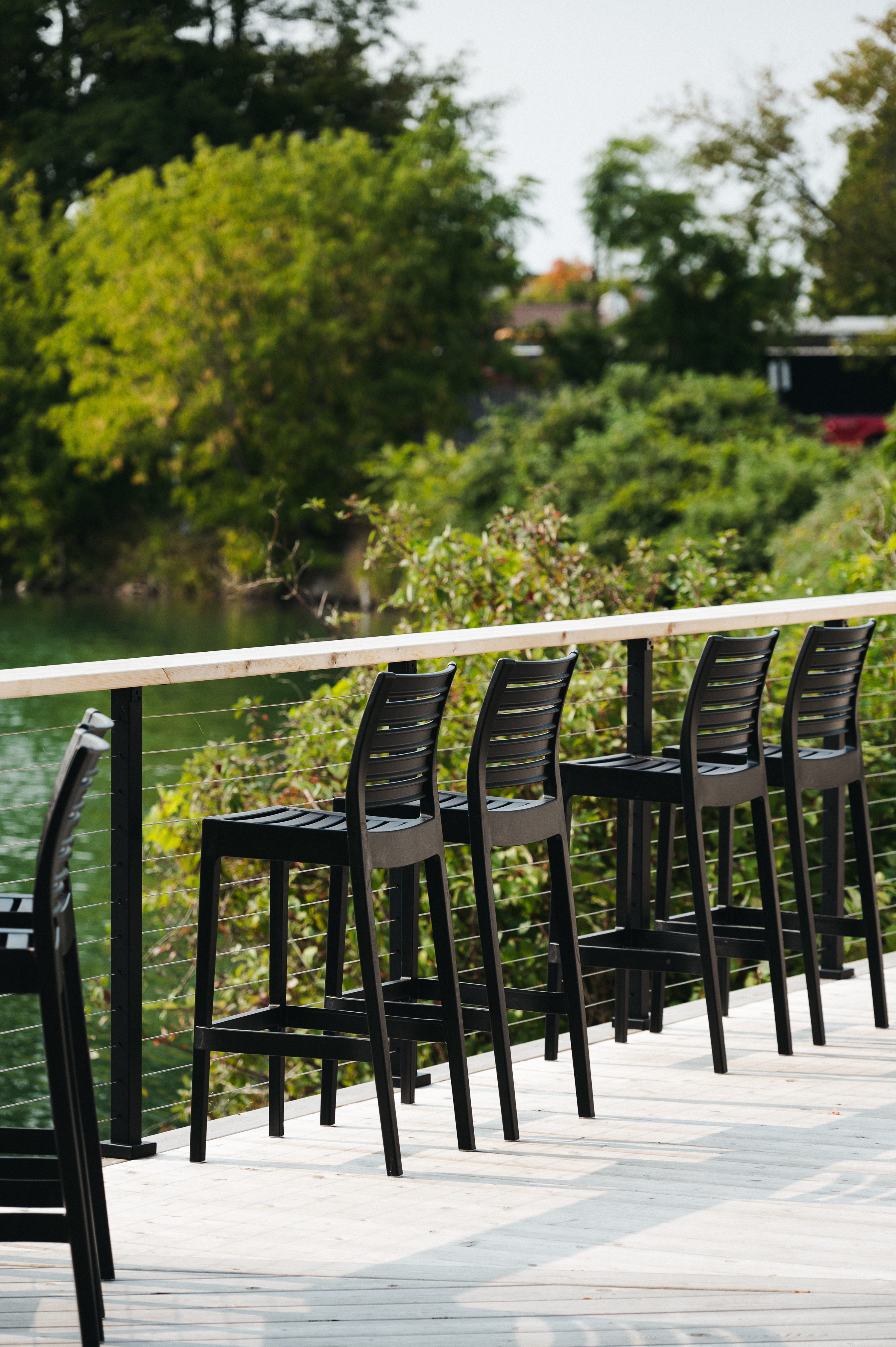 Solid-roof outdoor rooms that give you full protection without sacrificing the view. Open on all sides for the bay breeze. Covered when weather rolls in off the water. Built wide enough to seat a crowd on a still August evening. Pavilion roofs include integrated drainage so rainwater channels out through the posts — no buckets, no scrambling for cover.